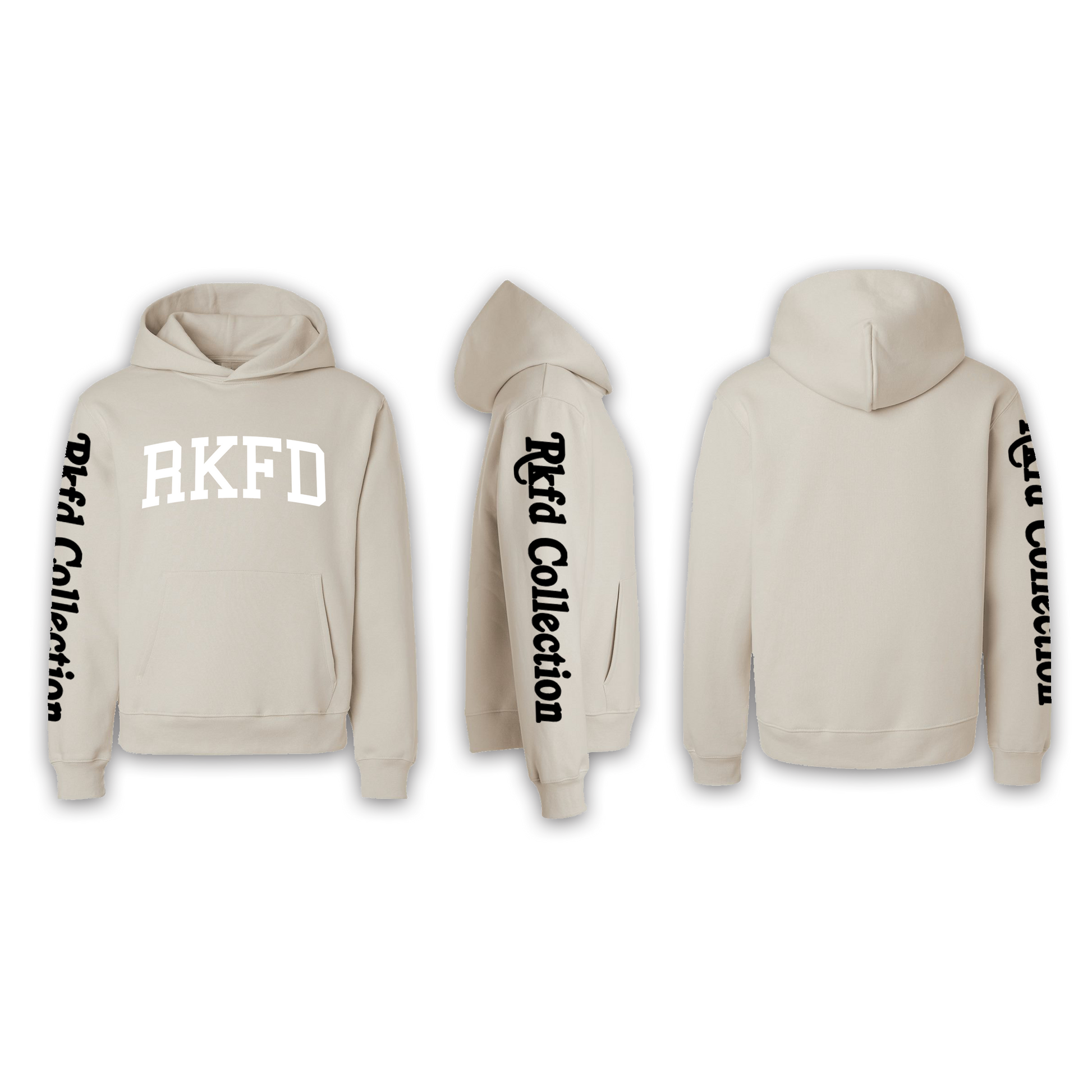 Front : "RKFD" white puff screen print, right sleeve "Rkfd Collection" black screen print