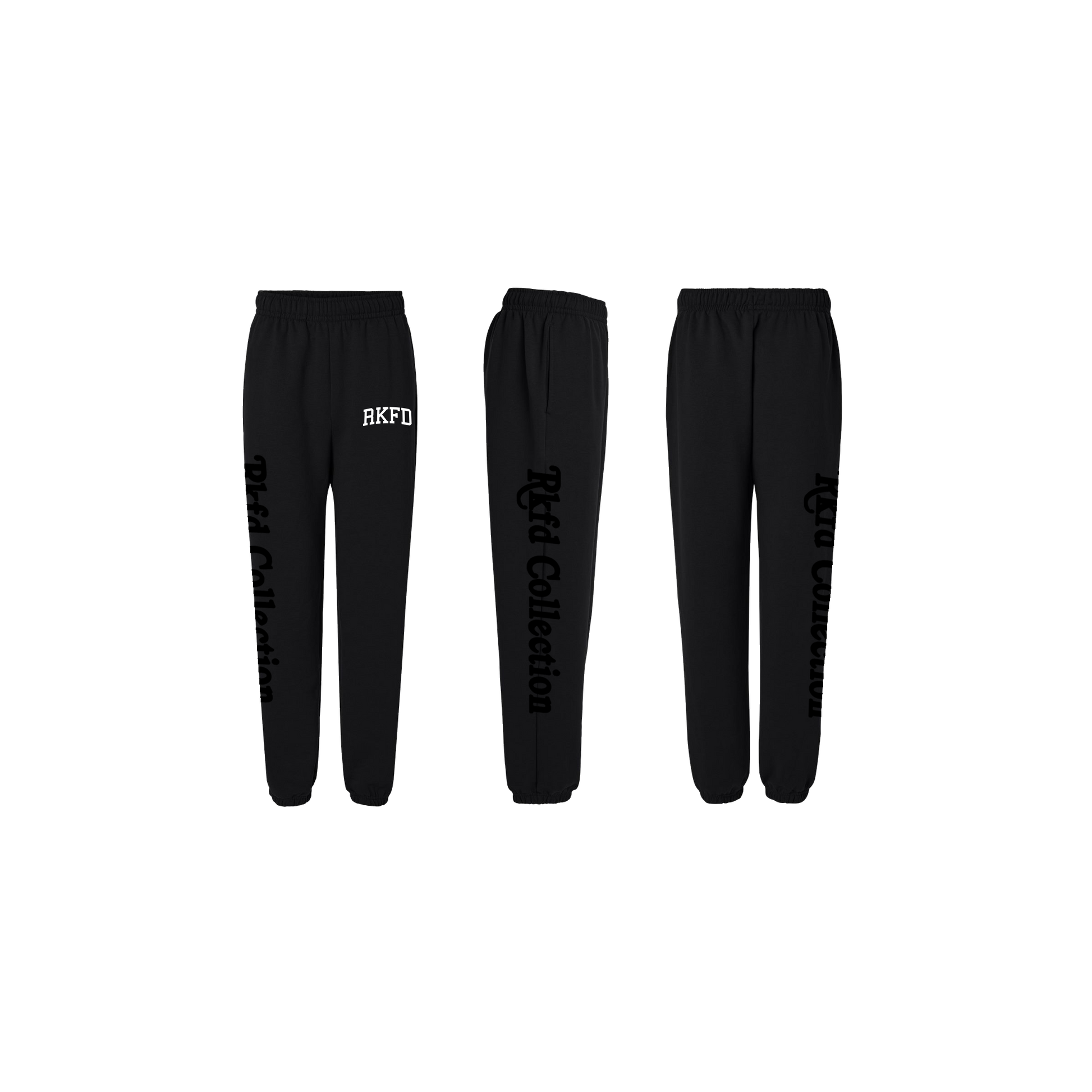 Front : "RKFD" white puff screen print, right leg "Rkfd Collection" black screen print